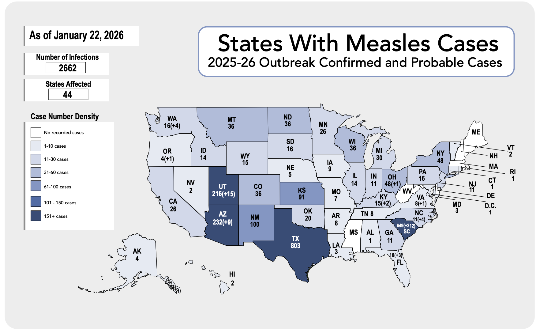 • South Carolina’s measles outbreak expanded by over 200 cases again this week, to a total of 646 cases. It’s now growing more quickly than the West Texas outbreak last year. (Brown Pandemic Center)